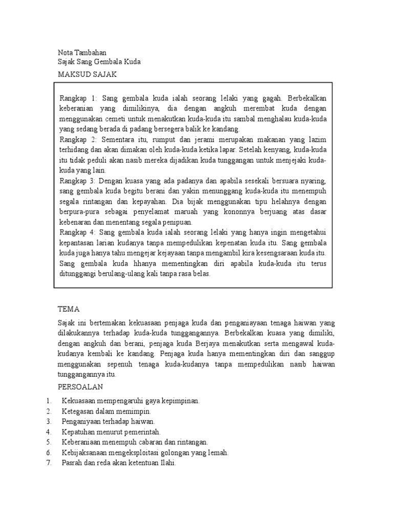 Sekali sekala suaranya kuat. Sajak Tingkatan 4 SANG GEMBALA KUDA Sang Gembala Kuda Mohd Hashim Othman MAKSUD Rangkap Maksud Rangkap 1 Dia lelaki bergelar perkasa dengan cemeti keberanian di tangan rembat angkuhnya memacu takut menghalau kuda-kuda di padang berebutan memburu kandang. SAJAK Rangkap 1 Dia lelaki bergelar perkasa dengan cemeti keberanian di tangan rembat angkuhnya memacu takut menghalau kuda-kuda di padang berebutan memburu kandang.