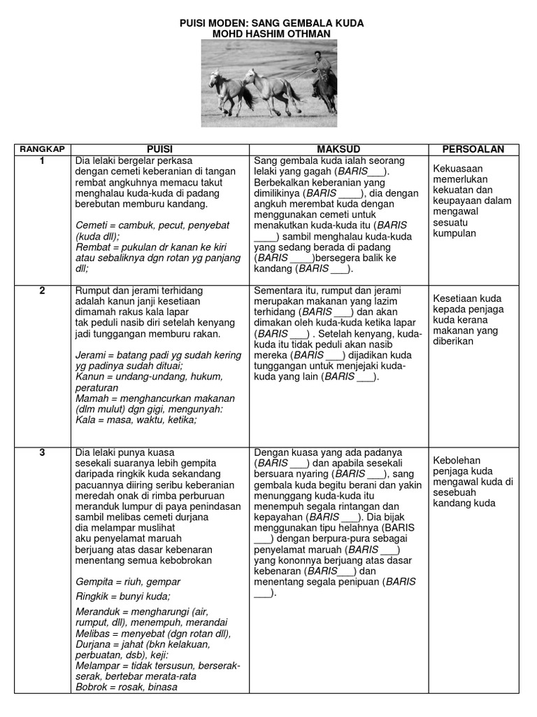 Menghalau kuda-kuda di padang. Sajak Sang Gembala Kuda T4 Fokus Soalan Komsas Cadangan Jawapan Contoh Soalan iii Jelaskan satu persoalan yang terdapat dalam petikan dan satu persoalan lain daripada keseluruhan dramacerpen yang tidak terdapat dalam petikan. Dalam kandang telah tersedia rumput dan jerami sebagai makanan yang menjadikan kuda sentiasa setiakuda ini tidak sedar dijadikan tunggangan untuk memburu kuda lain.