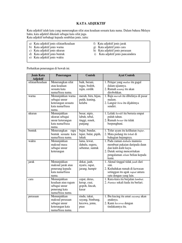 Kata Adjektif Biasanya kata adjektif didahului dengan kata. Saya akan menulis surat kepada mereka. Lihatlah contoh-contoh ayat berdasarkan setiap jenis kata adjektif di bawah.