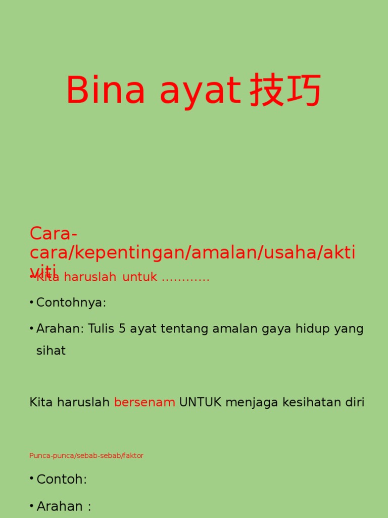 Tatabahasa - Ujian Bahasa Melayu kali ini menekankan aspek. Dalam contoh-contoh ayat di atas perkataan-perkataan yang condong ialah frasa adjektif. Contoh boleh wujud dalam pelbagai bentuk antaranya ialah contoh berbilang-bilang contoh tunggal statistik kajian laporan juga dalam bentuk analogi yang terdiri daripada kias ibarat simile perumpamaan dan sebagainya.